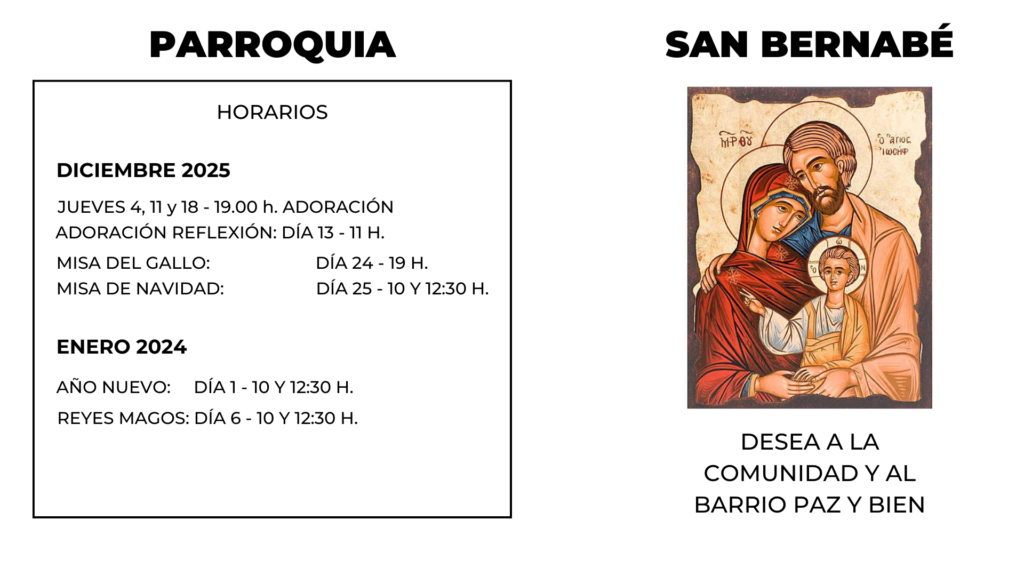 El Equipo Pastoral de la Parroquia de San Bernabé se quiere hacer presente entre vosotros para saludaros y para presentaros las informaciones referentes a la marcha de la Comunidad Parroquial y ponernos a vuestra disposición en todo aquello que podáis necesitar de la Parroquia.